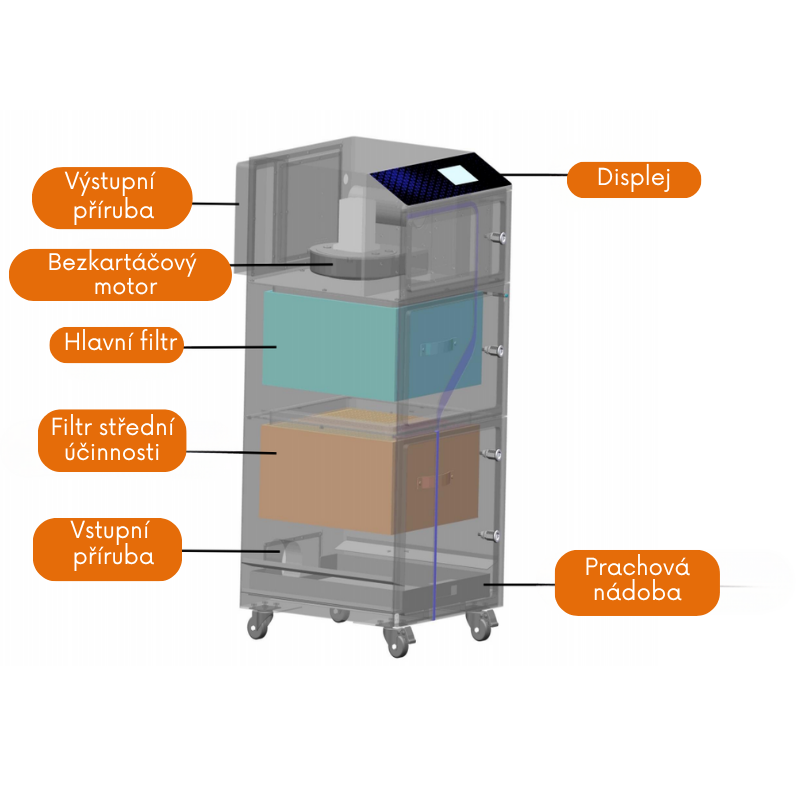 Kombinace robustního řešení pro odsávání prachu a účinného odstraňování organických pachů.